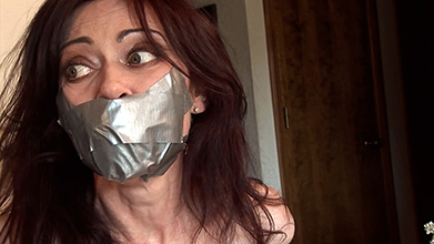 The intruder revisits Danielle. Her dress is hiked up around her neck, showing off her big, natural tits. A scarf is tied over her mouth twice, so she’s double-gagged, too!
